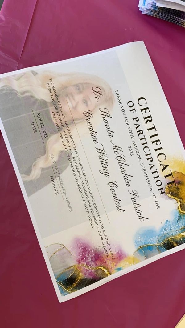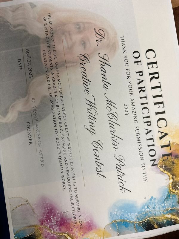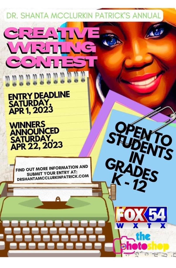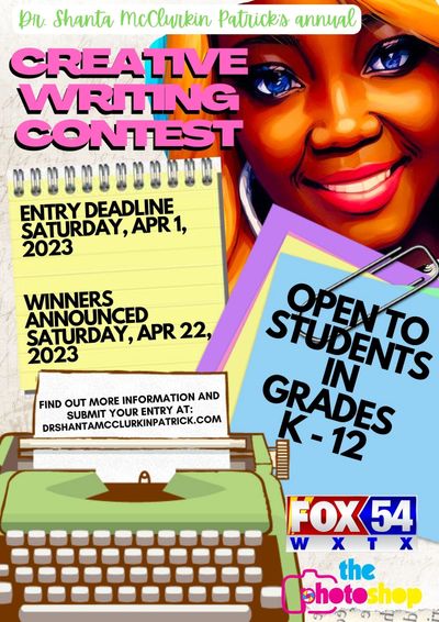 What: "Dr. Shanta McClurkin Patrick Creative Writing Contest". We are looking for original, fictional stories from students! Do you enjoy WRITING? Well, it’s YOUR turn to write a fictional story and have the chance to win CASH and PRIZES! In addition, we want you to integrate art into your story by creating up to three (3) original, clear and colorful illustrations that enhance your story. This is a CREATIVE writing contest.